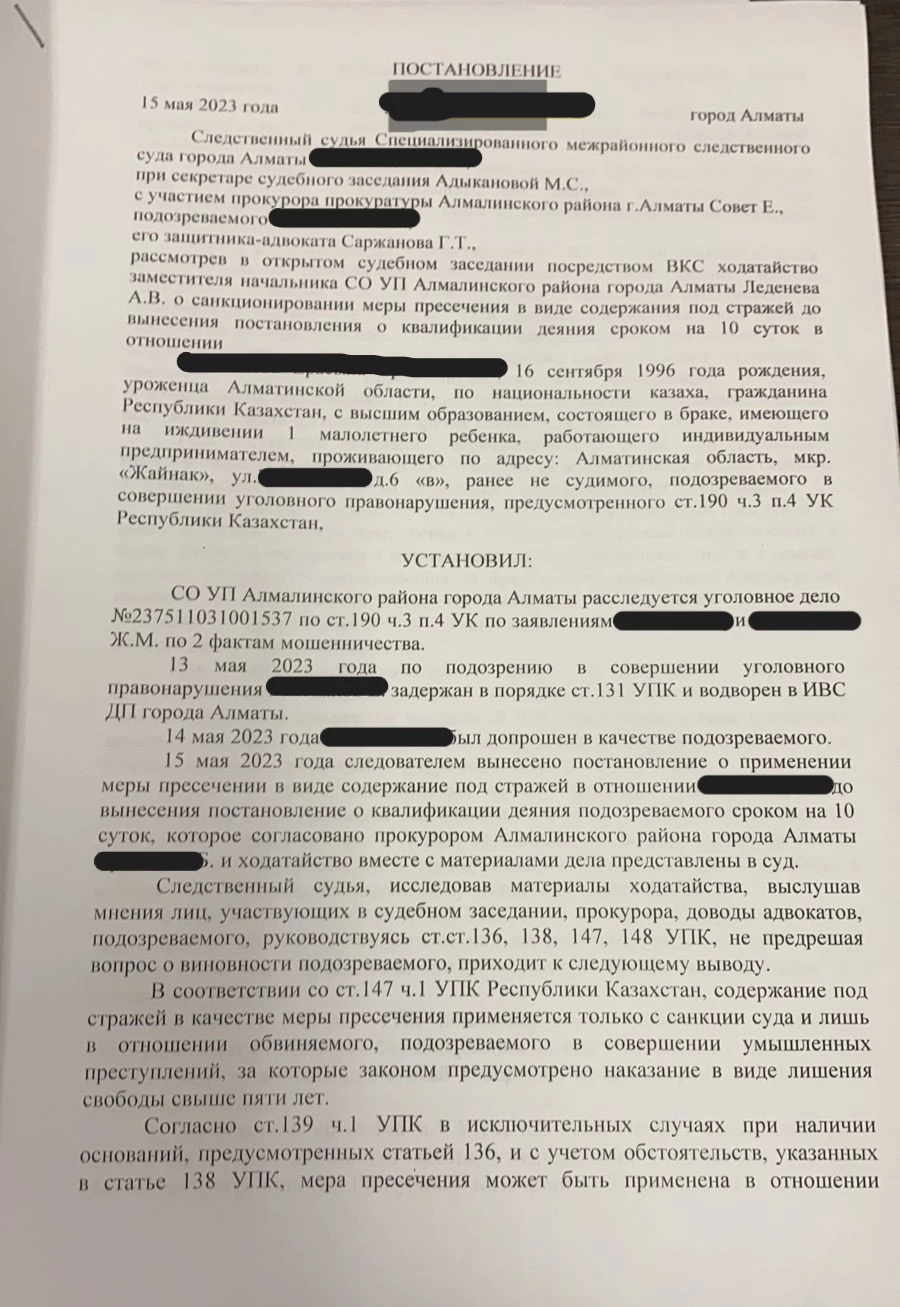A criminal case registered in the ERDR for No. 237511031001537 dated May 13, 2023 under art. 190, Part 3, paragraph 3 of the Criminal Code of the Republic of Kazakhstan is being investigated in the proceedings of the SB UP of the Almaly district of the DP of Almaty. Fraud against two or more persons.