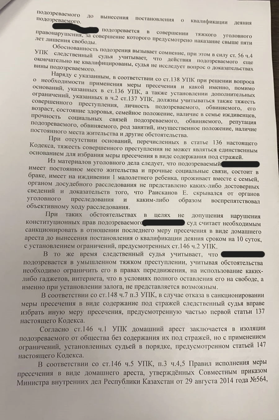 My client's guilt has not been confirmed, suspicion of committing a criminal offense, there are no grounds for applying a preventive measure in the form of detention to the detainees, the detention was carried out in significant violation of the requirements of Article 131 of the Criminal Procedure Code of the Republic of Kazakhstan, that is, during the arrests they did not invite a defense lawyer, did not inform relatives, did not give an opportunity to call a lawyer, and there are no legitimate grounds for the relatives for detention.