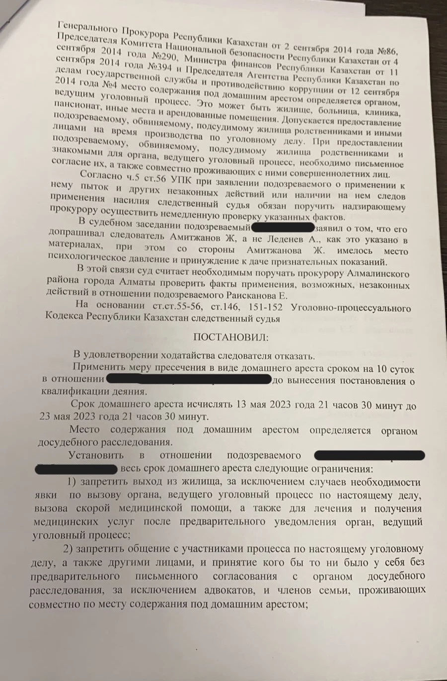 On May 15, 2023, the senior investigator of the Almaly district Police Department of Almaty initiated Petitions for the application of a preventive measure in the form of detention for a period of 10 days until the qualification was determined, to which the district prosecutor's office agreed and sent it to the Specialized Interdistrict Investigative Court of Almaty.