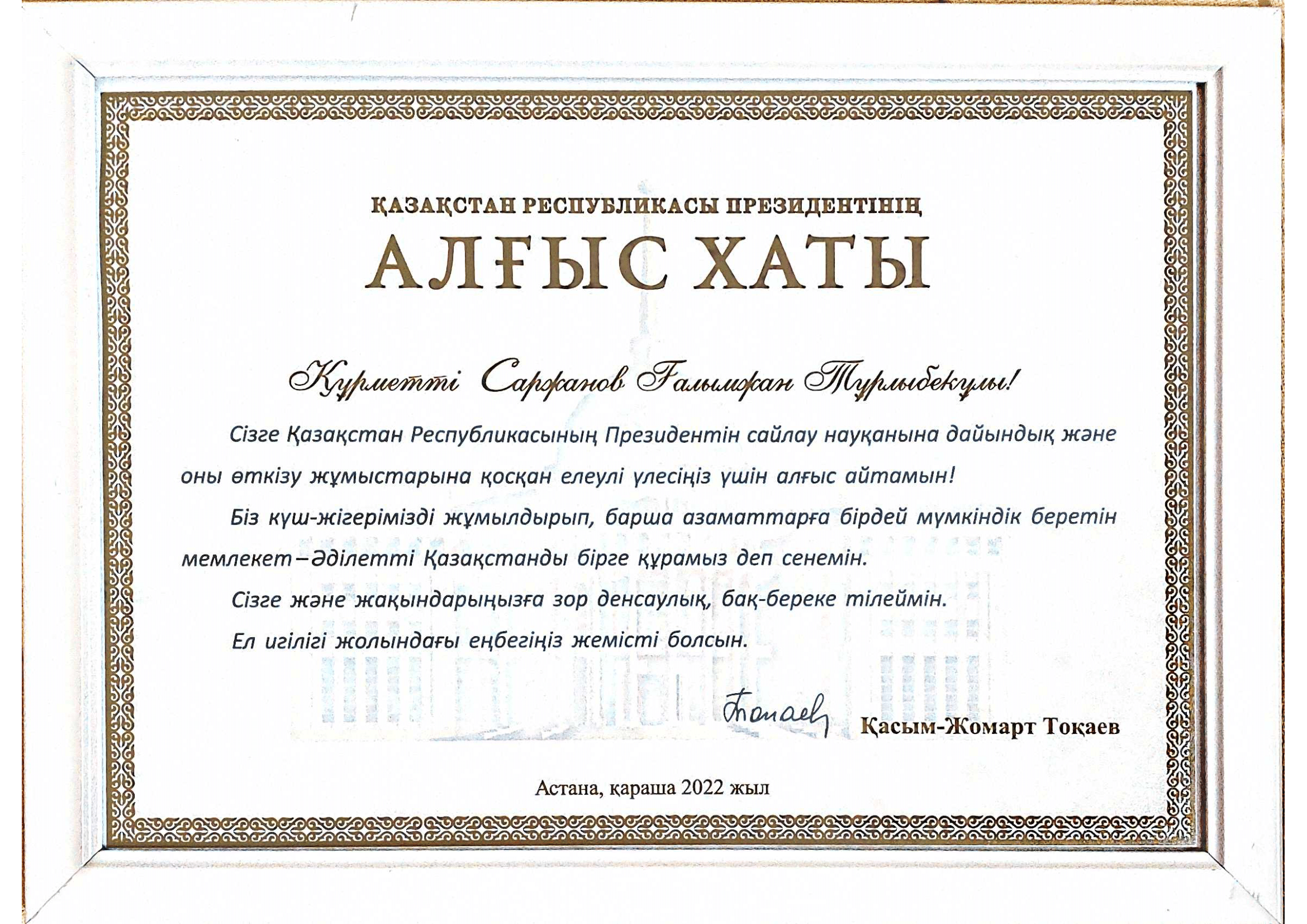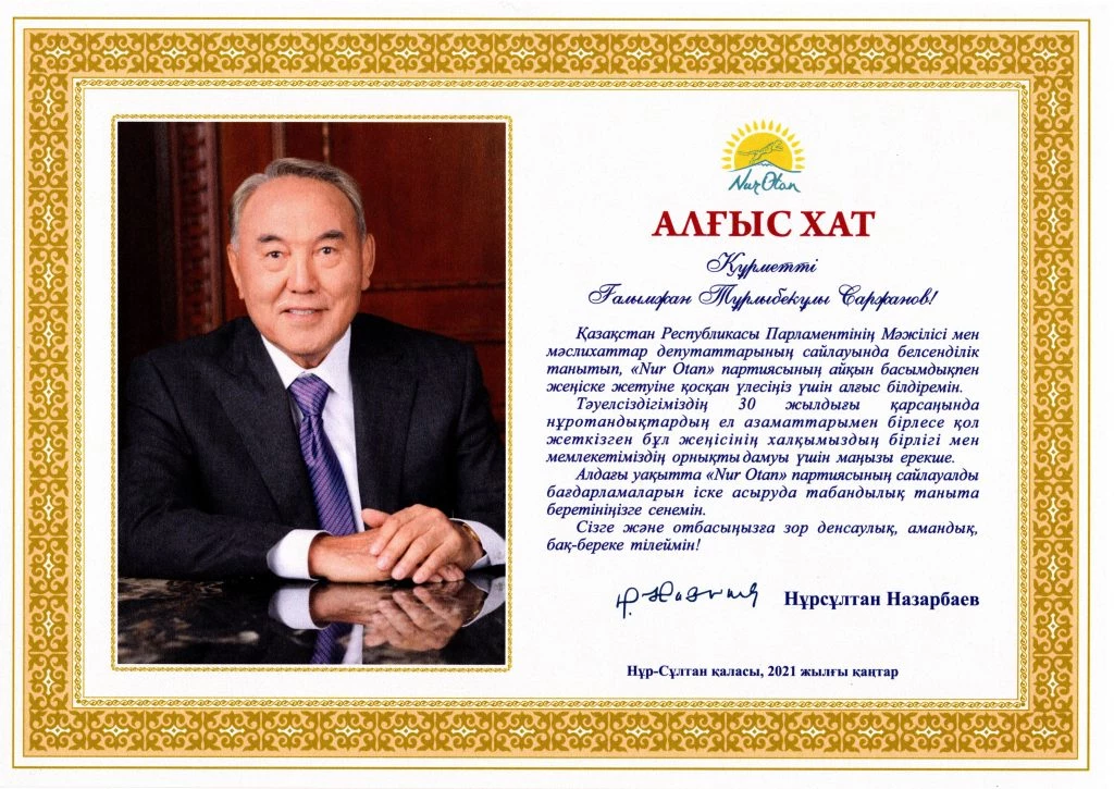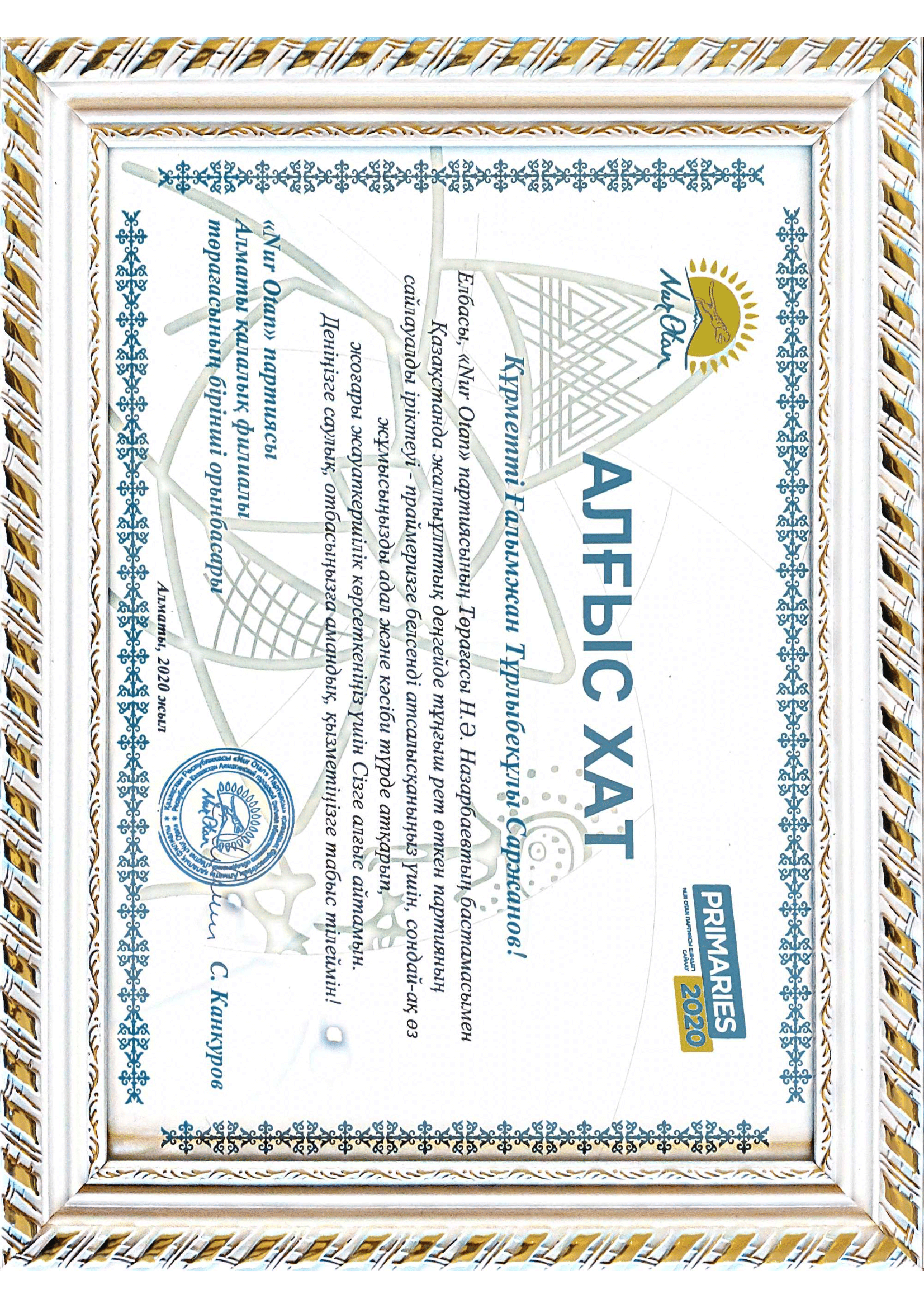 Саржанов Галымжан Турлыбекович являясь членом партии «Amanat», активно участвует в общественной жизни города и со своей стороны решает на безвозмездной основе житейские проблемы социально-уязвимых слоев населения. Вносит лепту в развитии юридической грамотности населения нашего города.