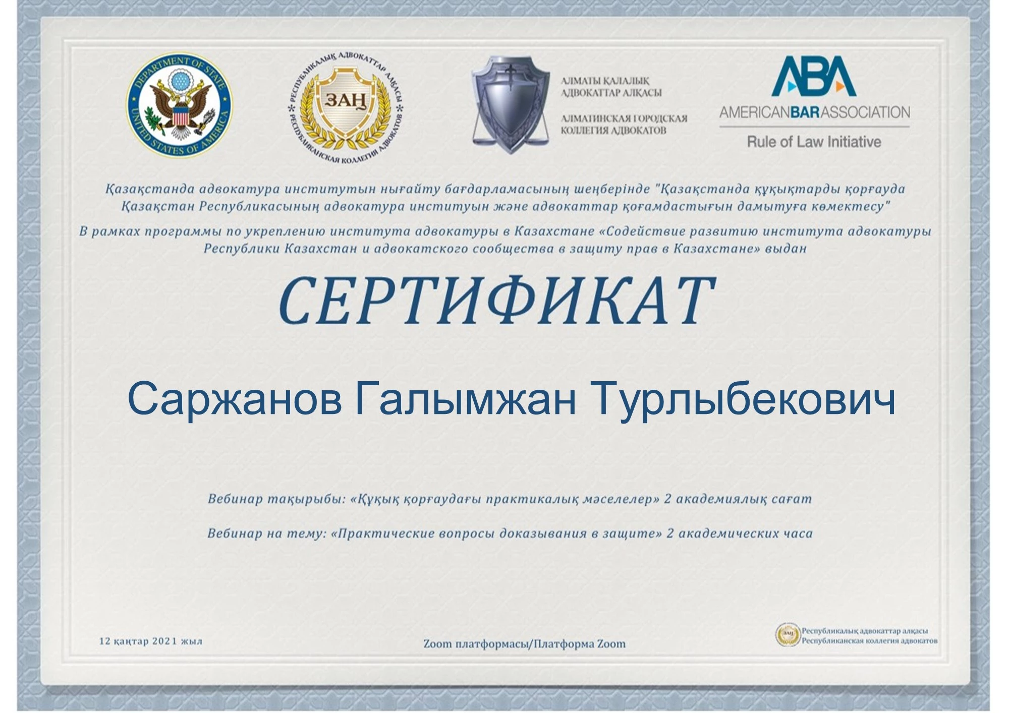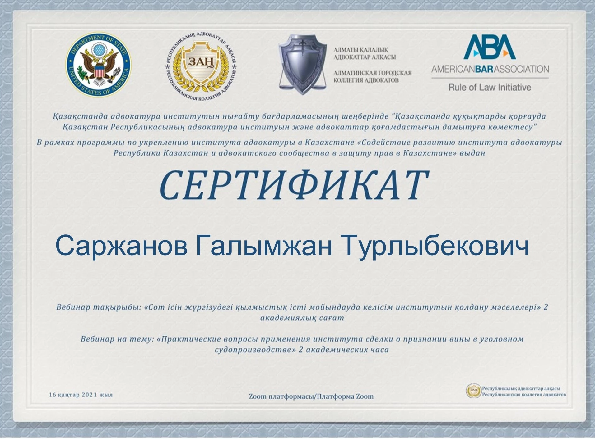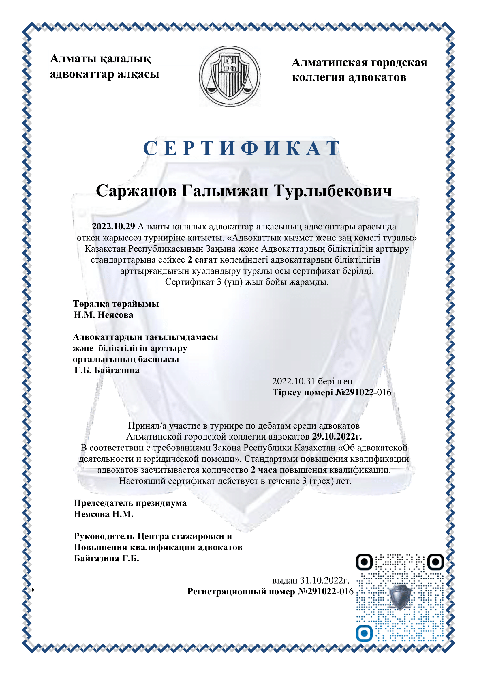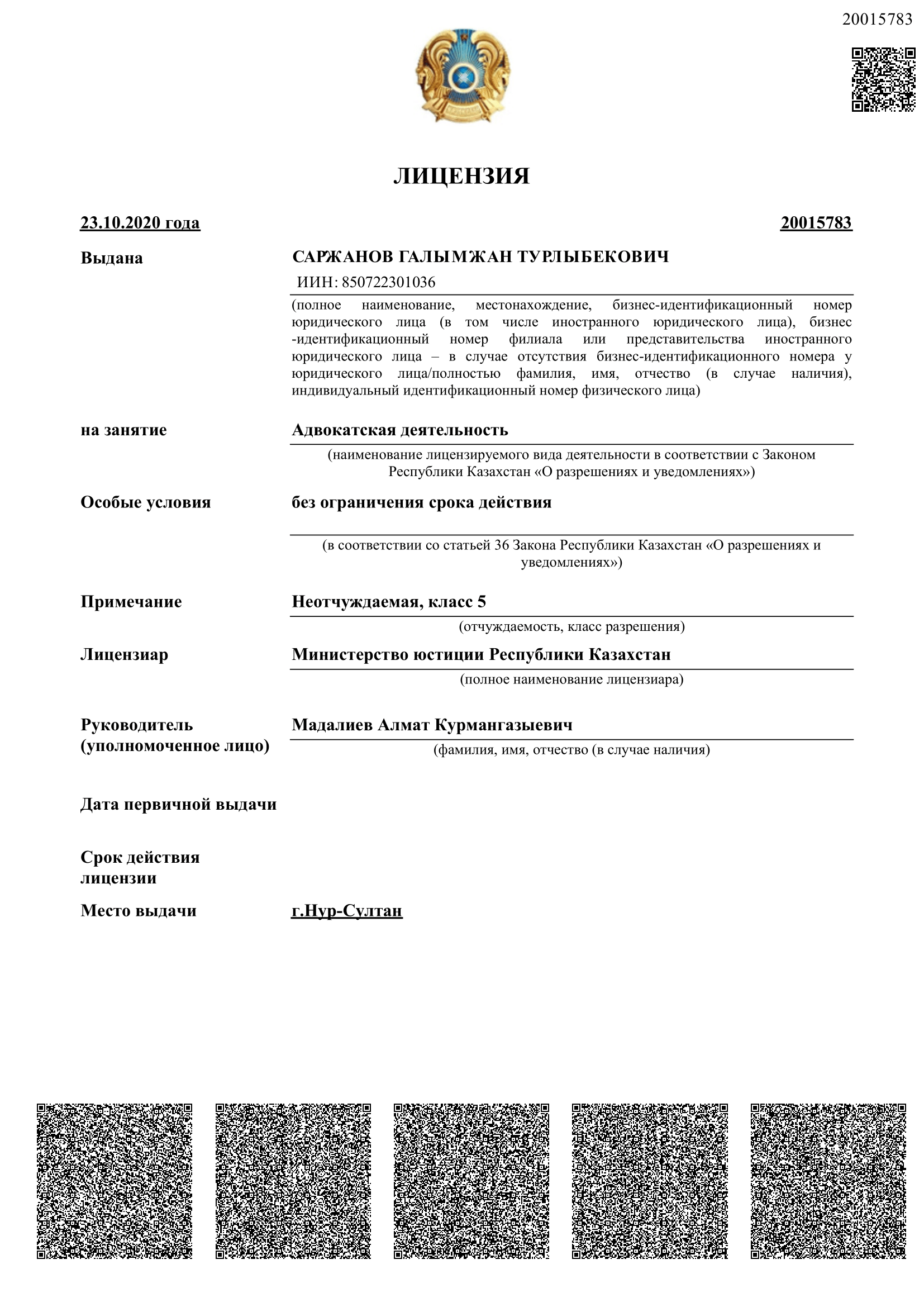 С ноября 2020 года по настоящее время Адвокат в Алматинской городской коллегии адвокатов Лицензия №20015783.