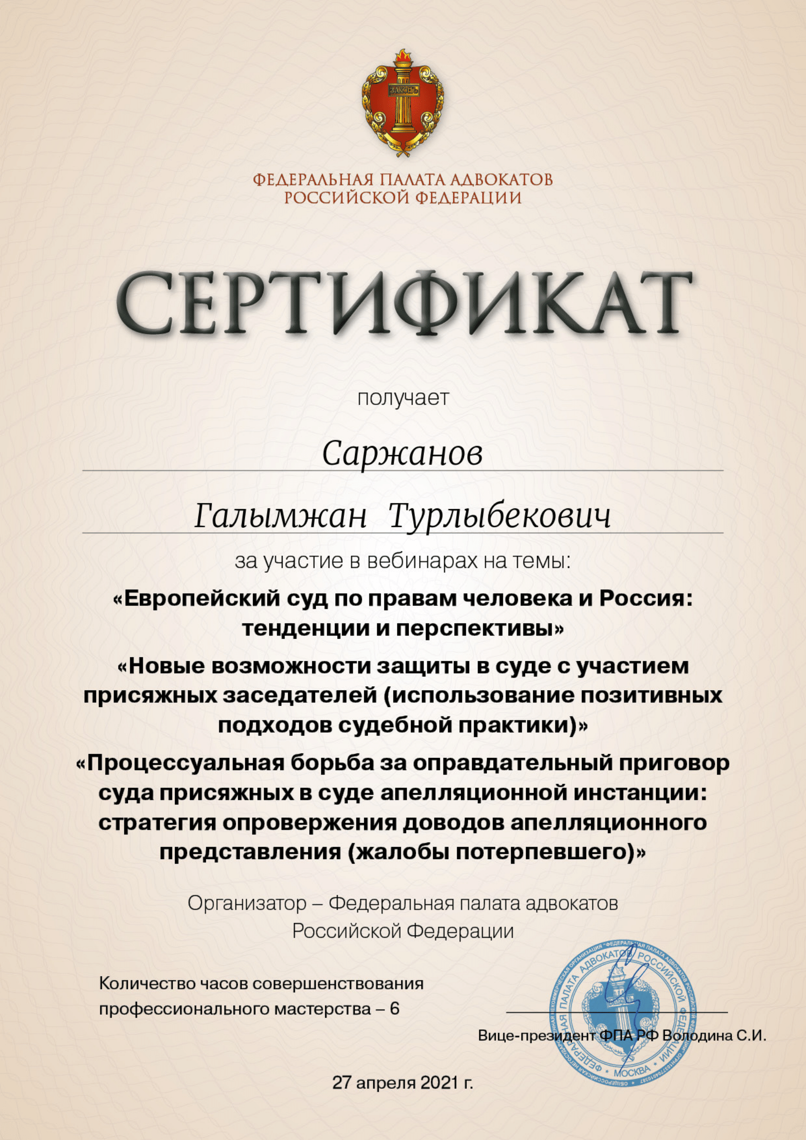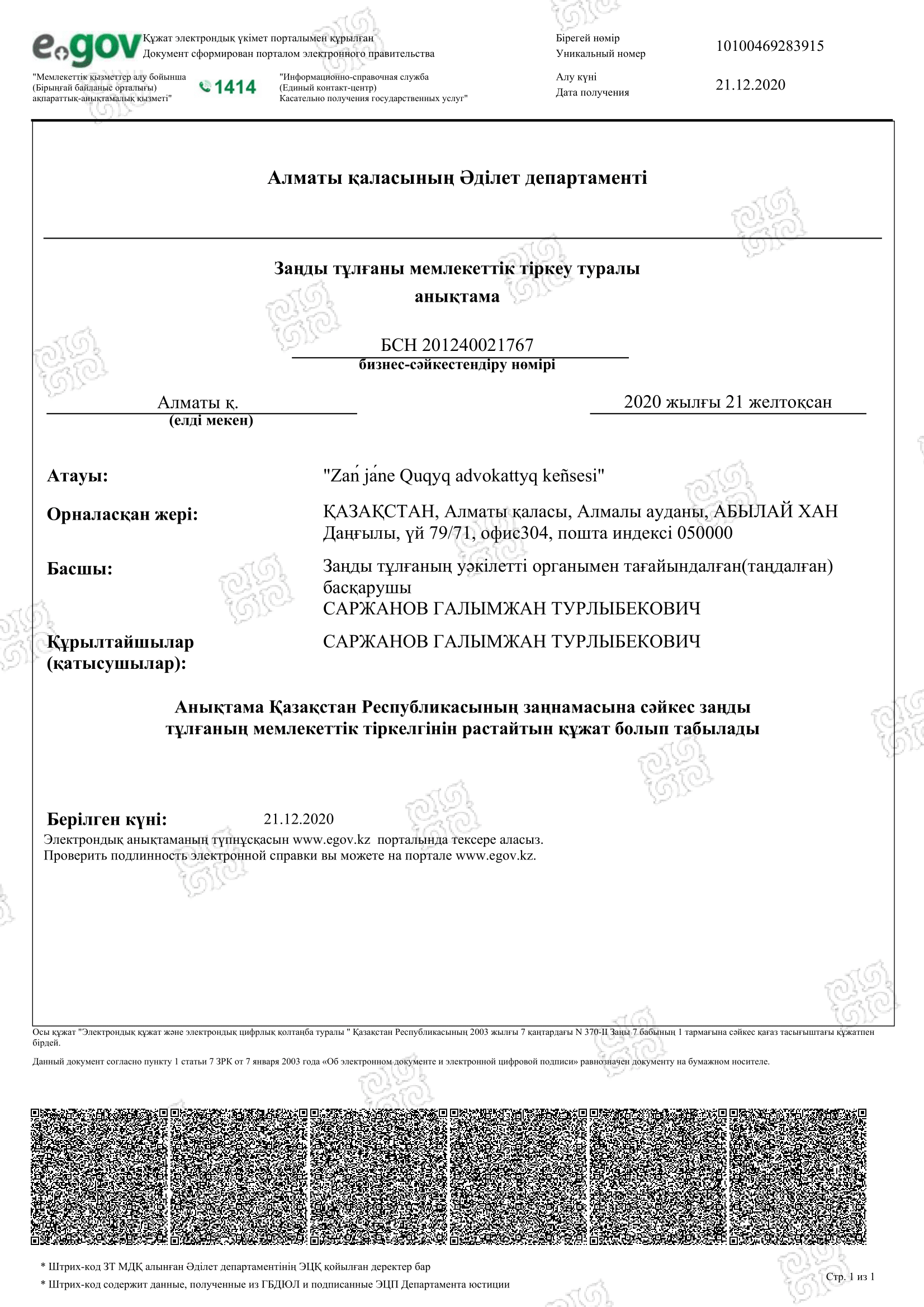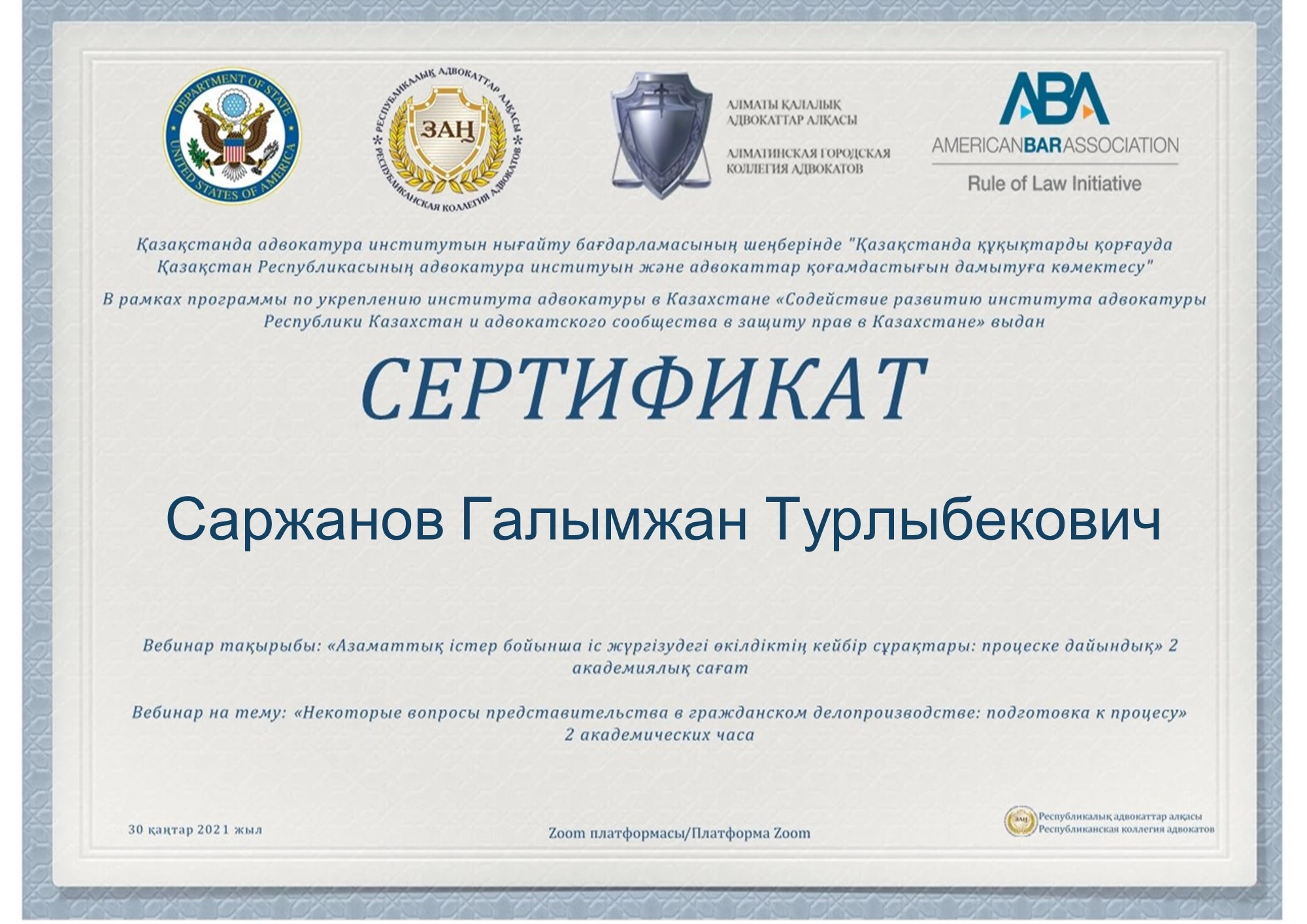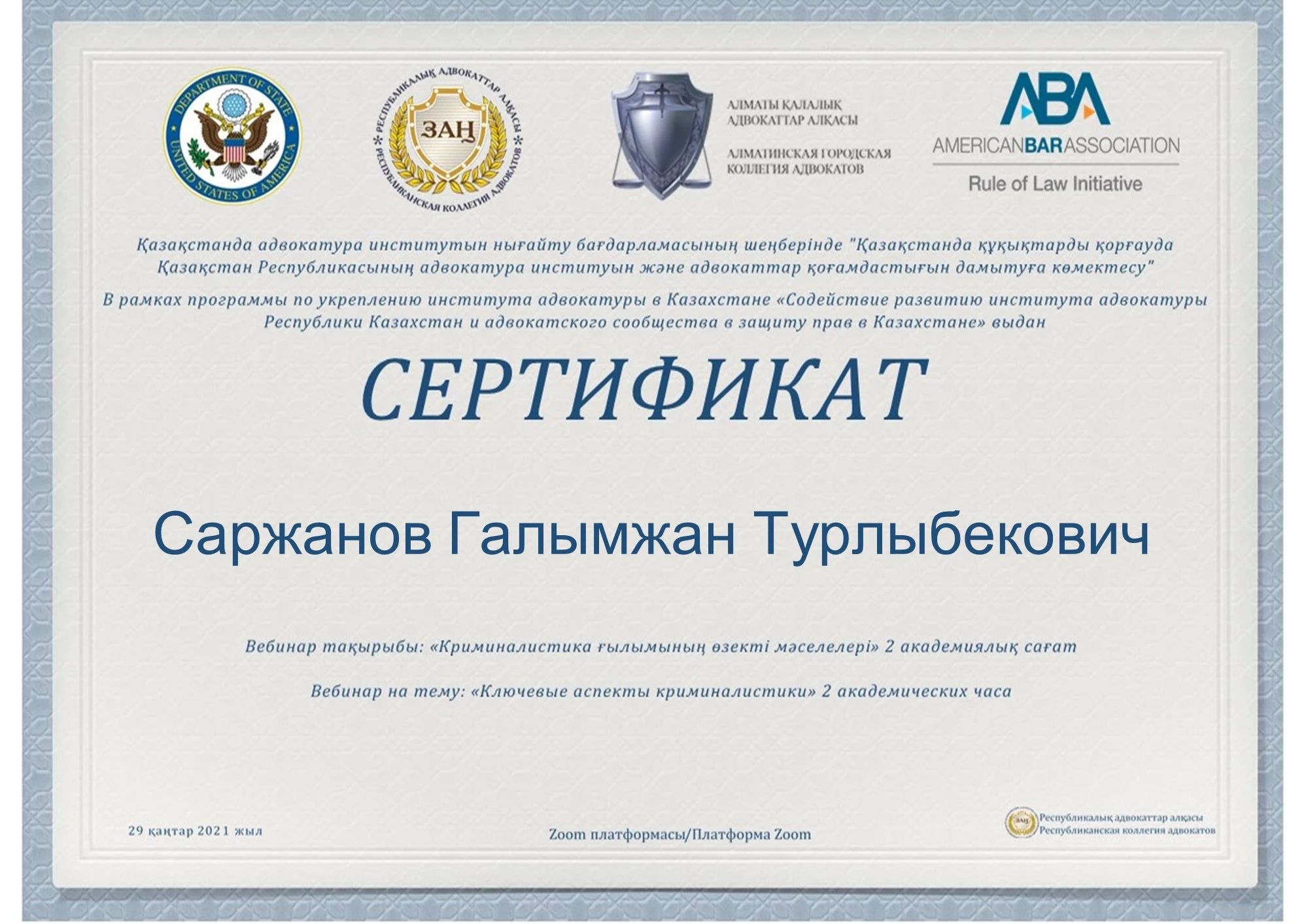 С ноября 2020 года по настоящее время Адвокат в Алматинской городской коллегии адвокатов Лицензия №20015783.
